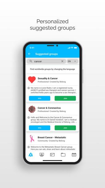 이 앱은 또한 세계 최초의 실시간 대화형 AI 종양 멘토인 "Dave"를 특징으로 하며, 암과 여정에 대한 질문과 우려에 공감하고 맞춤형 답변을 제공합니다. Belong를 통해 당신은 지원적이고 주의 깊으며 상호작용적인 환자 커뮤니티에 접근할 수 있으며, 당신의 특정한 필요, 관심사, 우려에 맞춤화된 환자와 보호자의 소셜 네트워크를 포함합니다. 게다가, 이 앱은 맞춤형 콘텐츠와 업데이트를 제공하며, 단계별로 팁과 알림을 제공하는 치료 내비게이션 도구도 제공합니다.